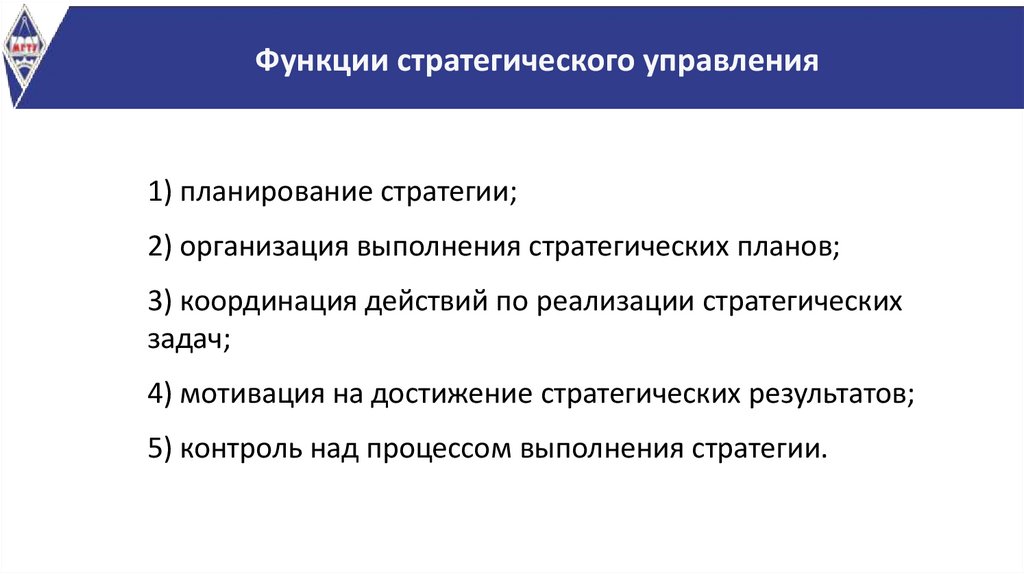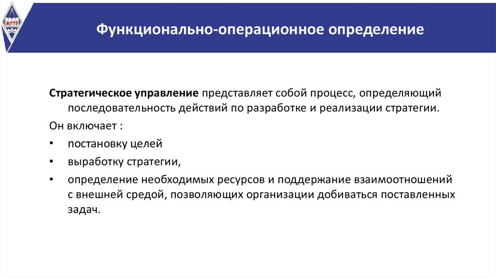 Функционально-операционное определениеСтратегическое управление представляет собой процесс, определяющий