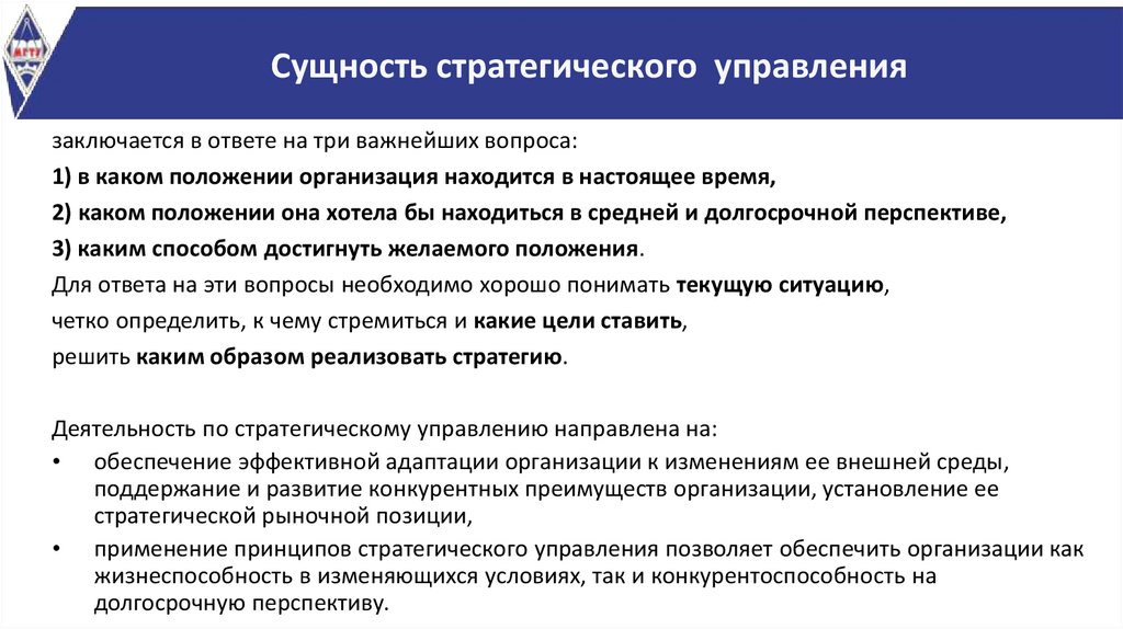 Сущность стратегического управлениязаключается в ответе на три важнейших вопроса:
