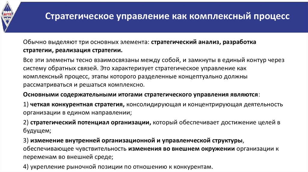 Стратегическое управление как комплексный процессОбычно выделяют три основных элемента: стратегический анализ, разработка
