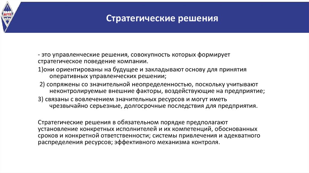 Стратегические решения- это управленческие решения, совокупность которых формирует