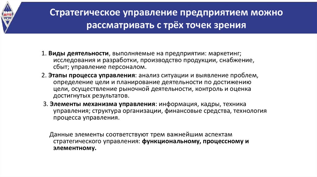 Стратегическое управление предприятием можнорассматривать с трёх точек зрения