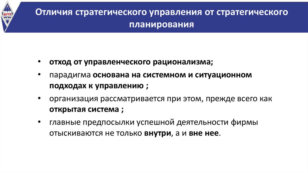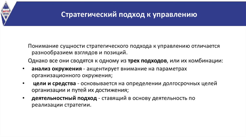 Стратегический подход к управлениюПонимание сущности стратегического подхода к управлению отличается