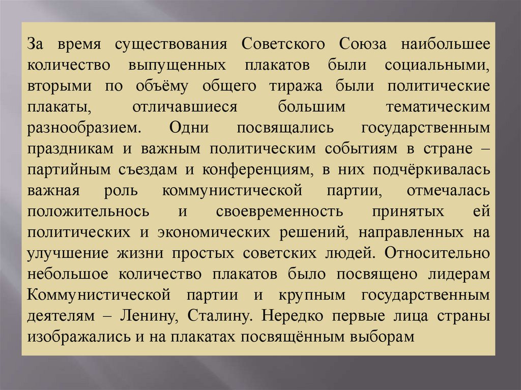 За время существования Советского Союза наибольшееколичество выпущенных плакатов были социальными,