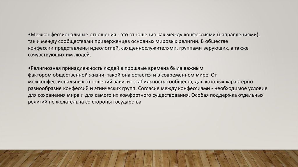 •Межконфессиональные отношения - это отношения как между конфессиями (направлениями),так и между сообществами приверженцев основных мировых религий. В обществе