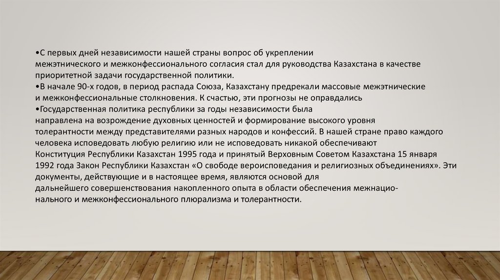 •С первых дней независимости нашей страны вопрос об укреплениимежэтнического и межконфессионального согласия стал для руководства Казахстана в качестве