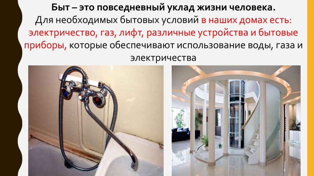 Быт – это повседневный уклад жизни человека.Для необходимых бытовых условий в наших домах есть: