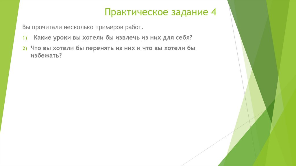 Практическое задание 4Вы прочитали несколько примеров работ.