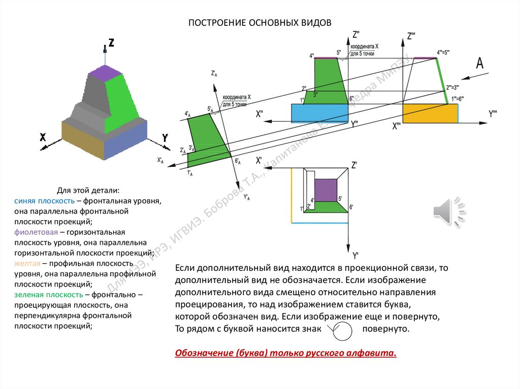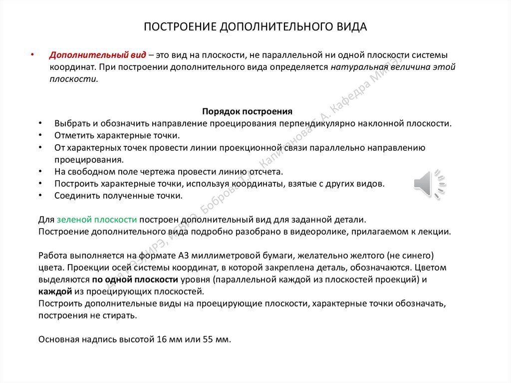 Построение дополнительного вида подробно разобрано в видеоролике, прилагаемом к лекции.