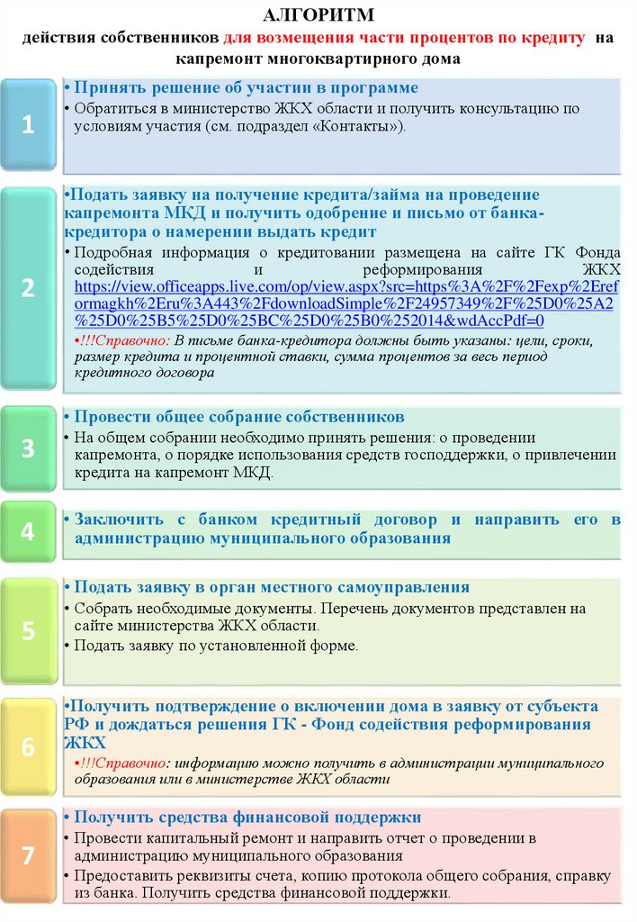 Алгоритм действия собственников для возмещения части процентов по кредиту на капремонт многоквартирного дома