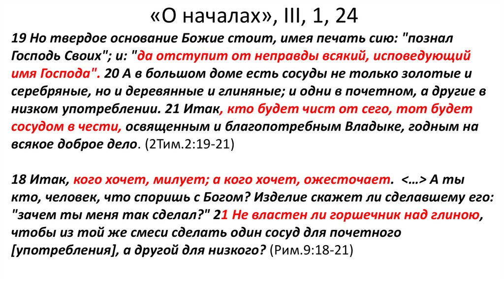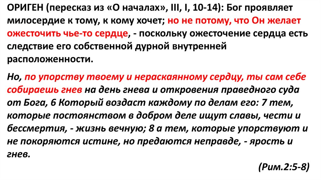 ОРИГЕН (пересказ из «О началах», III, I, 10-14): Бог проявляетмилосердие к тому, к кому хочет; но не потому, что Он желает