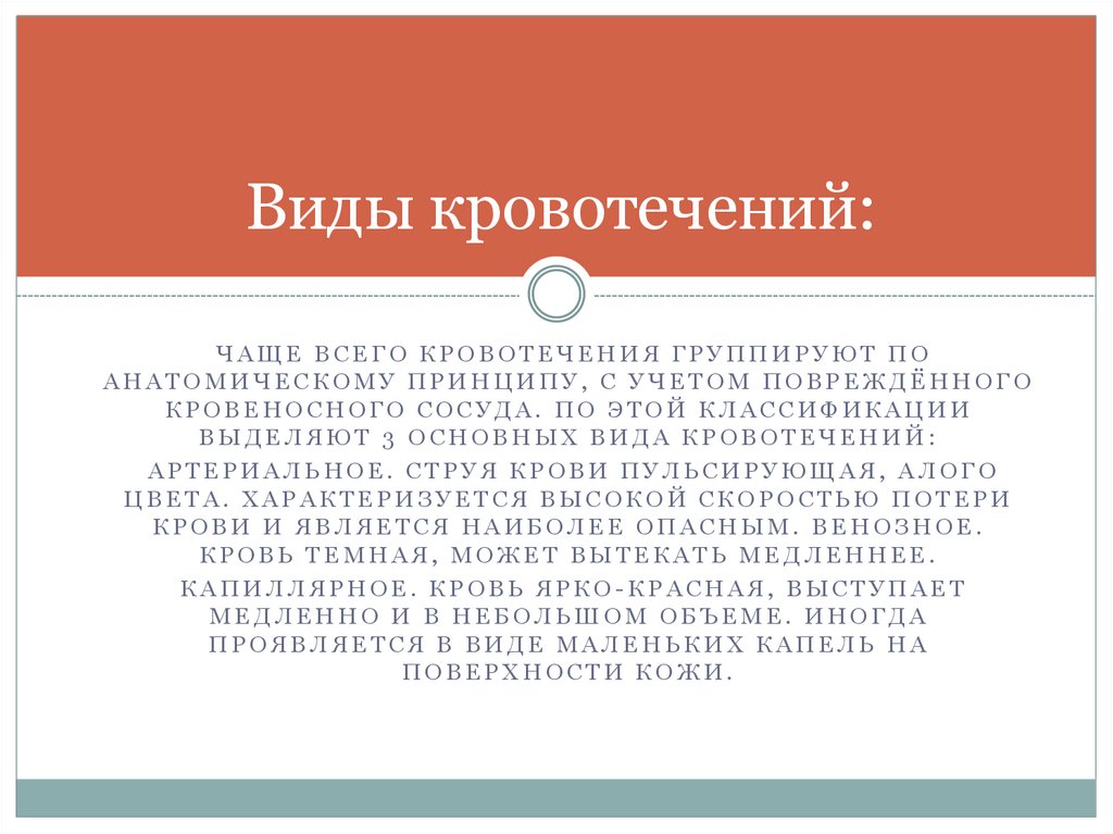 Виды кровотечений:ЧАЩЕ ВСЕГО КРОВОТЕЧЕНИЯ ГРУППИРУЮТ ПО