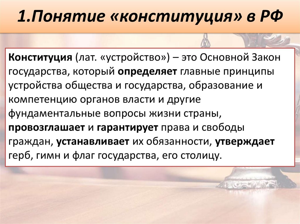 1.Понятие «конституция» в РФКонституция (лат. «устройство») – это Основной Закон