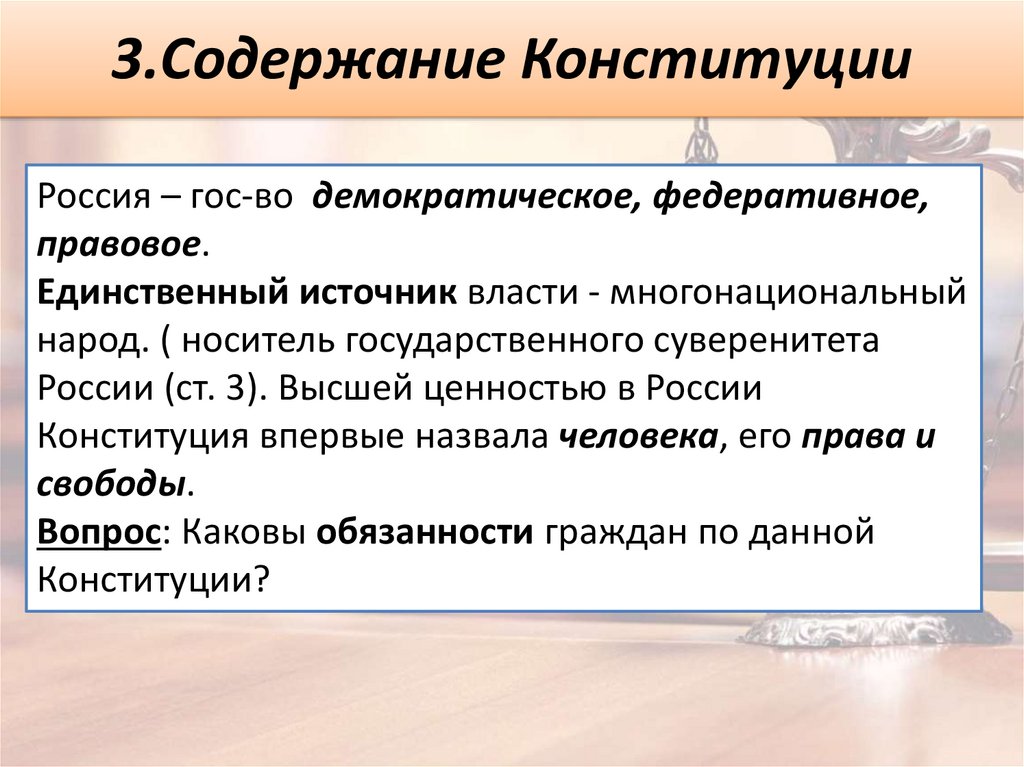 3.Содержание КонституцииРоссия – гос-во демократическое, федеративное,