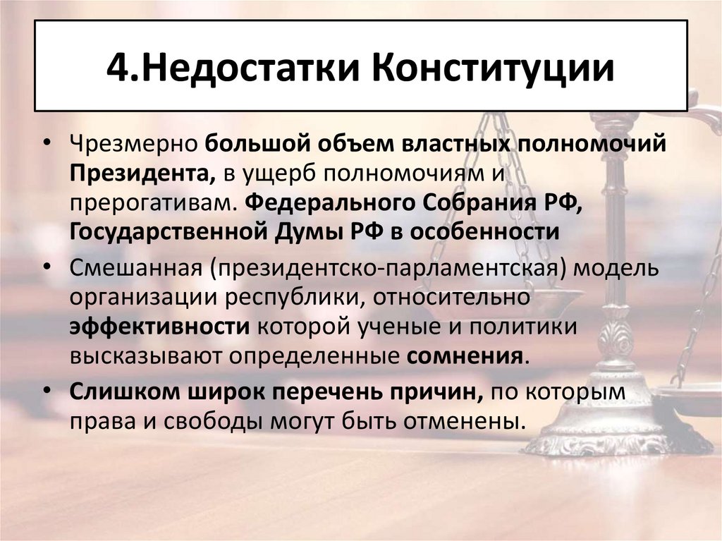 4.Недостатки Конституции• Чрезмерно большой объем властных полномочий