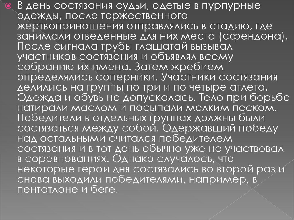 В день состязания судьи, одетые в пурпурныеодежды, после торжественного