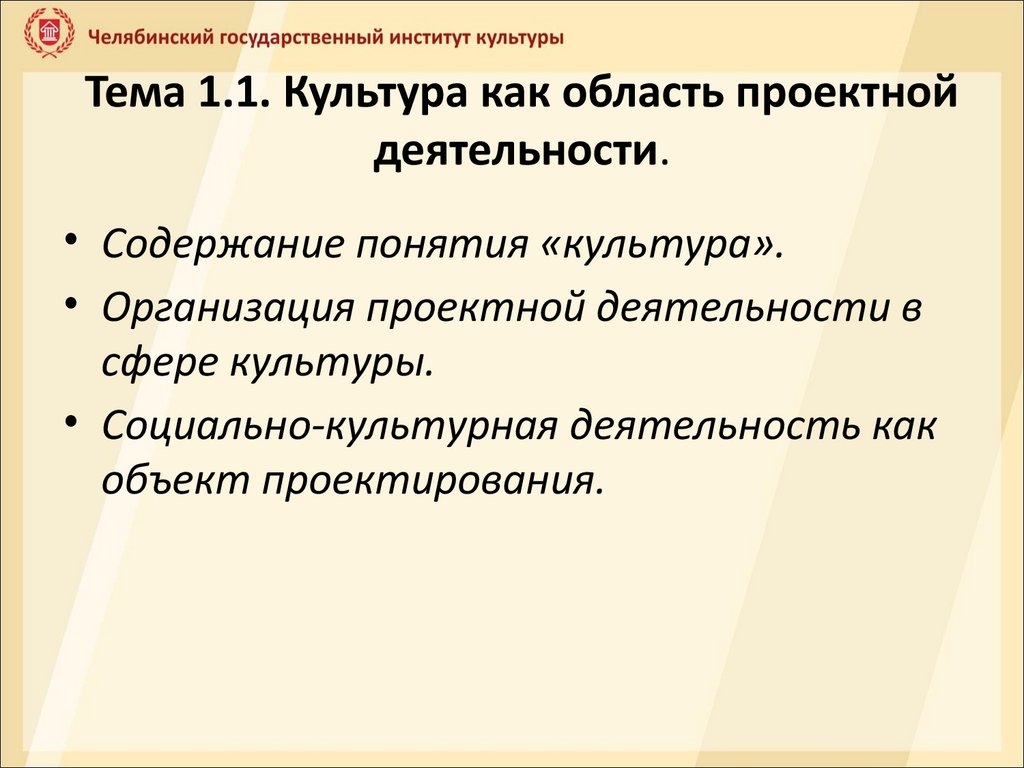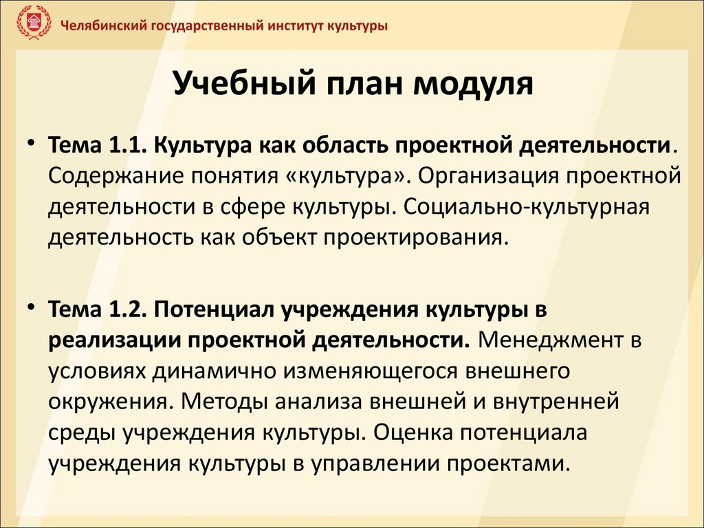 Учебный план модуля• Тема 1.1. Культура как область проектной деятельности.