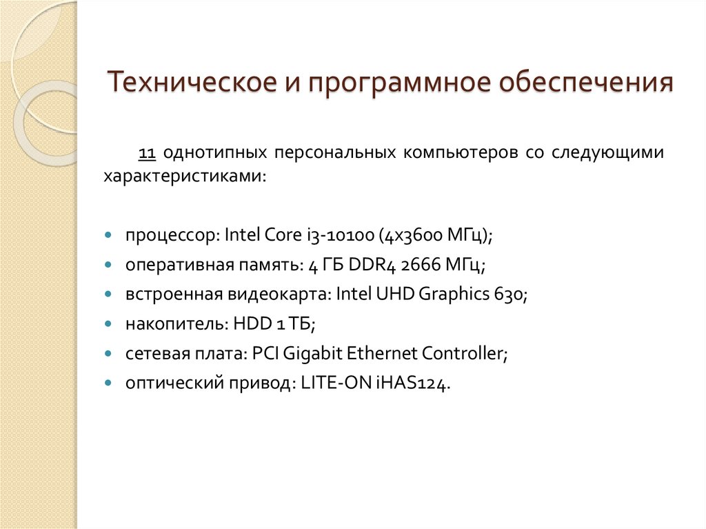 Техническое и программное обеспечения11 однотипных персональных компьютеров со следующими