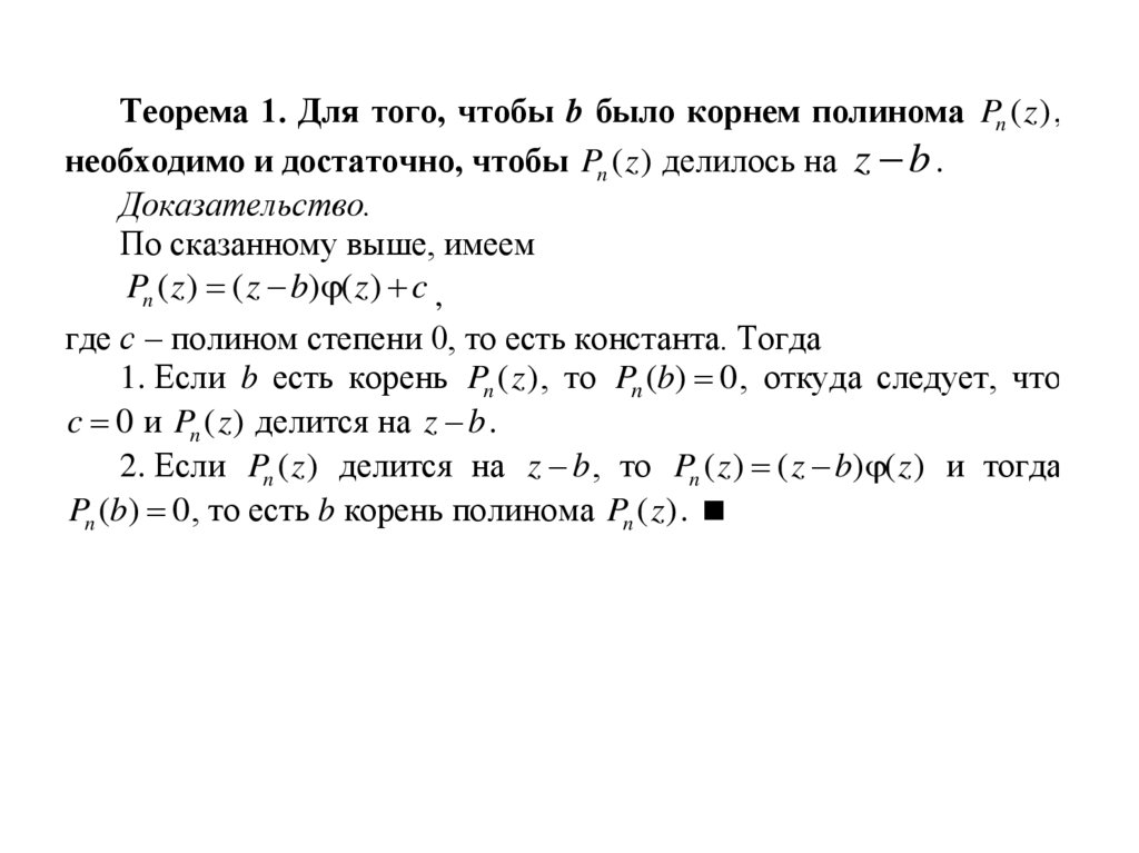 Теорема 1. Для того, чтобы b было корнем полинома Pn (z ) ,необходимо и достаточно, чтобы Pn (z ) делилось на z b .
