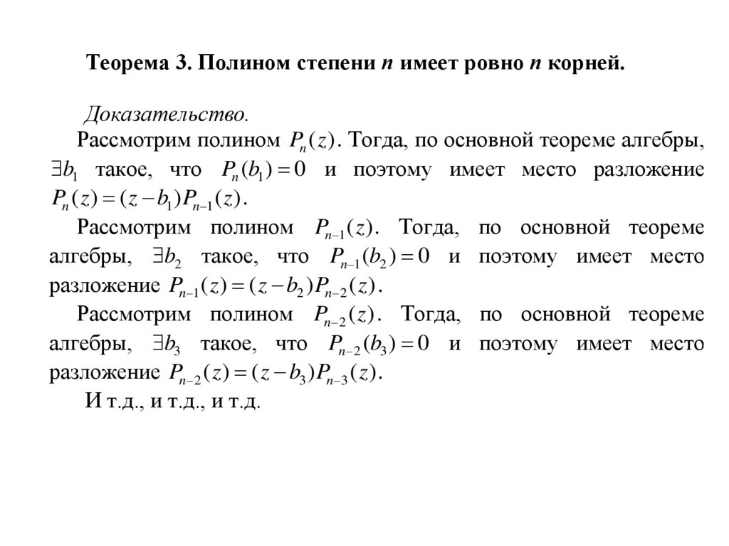 Теорема 3. Полином степени п имеет ровно п корней.Доказательство.