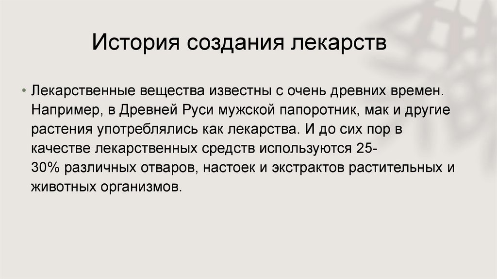 История создания лекарств• Лекарственные вещества известны с очень древних времен.