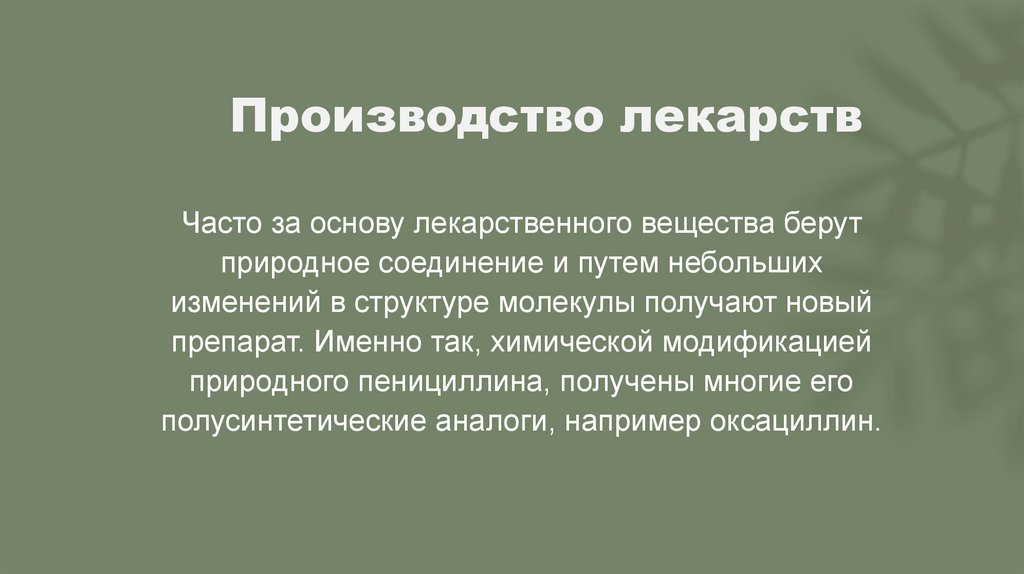 Производство лекарств• Часто за основу лекарственного вещества берут