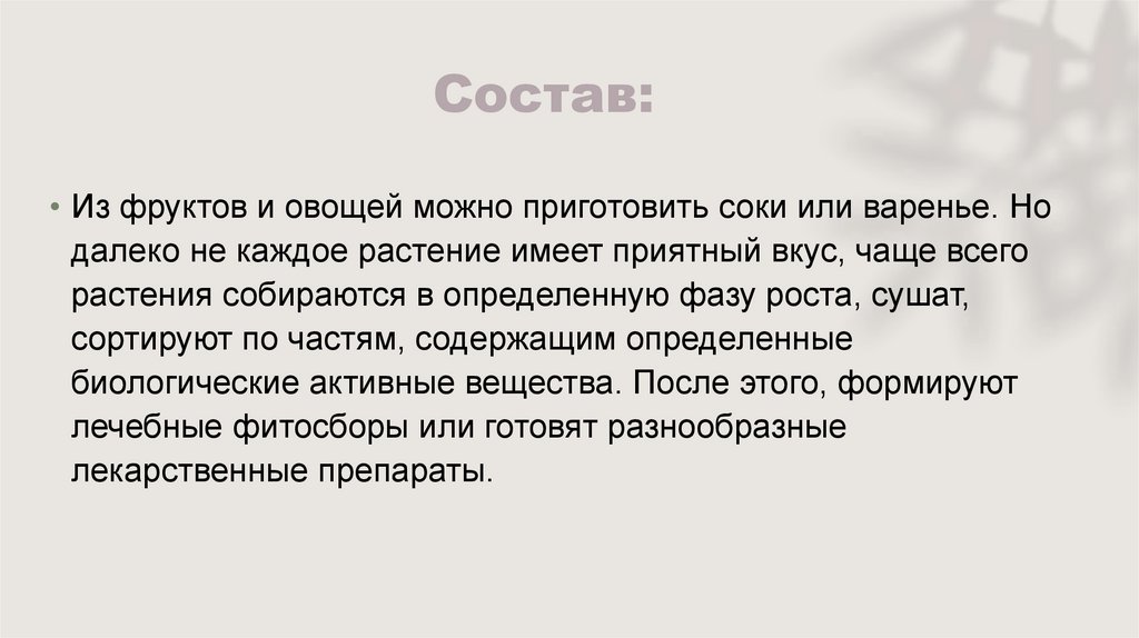 Состав:• Из фруктов и овощей можно приготовить соки или варенье. Но