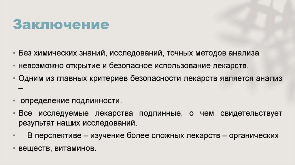Заключение• Без химических знаний, исследований, точных методов анализа