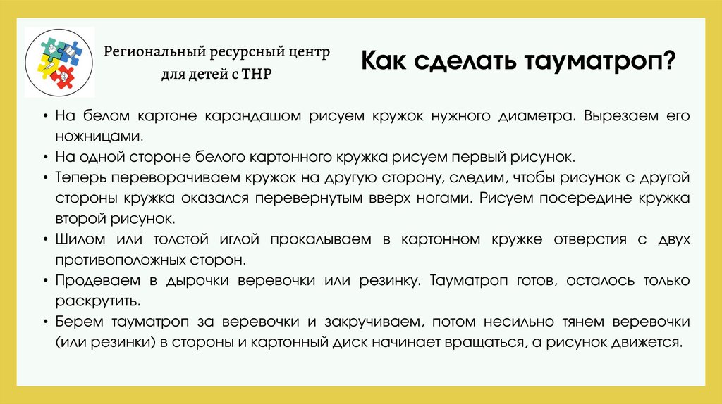• Продеваем в дырочки веревочки или резинку. Тауматроп готов, осталось только