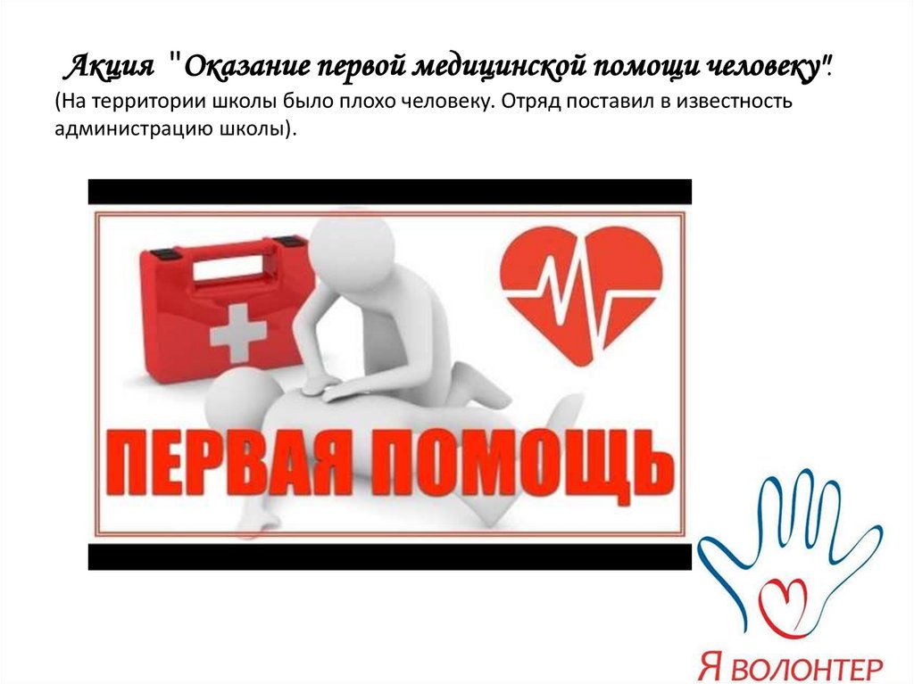 Акция "Оказание первой медицинской помощи человеку".(На территории школы было плохо человеку. Отряд поставил в известность