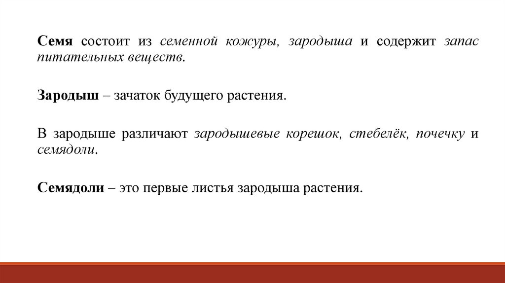 Семя состоит из семенной кожуры, зародыша и содержит запаспитательных веществ.