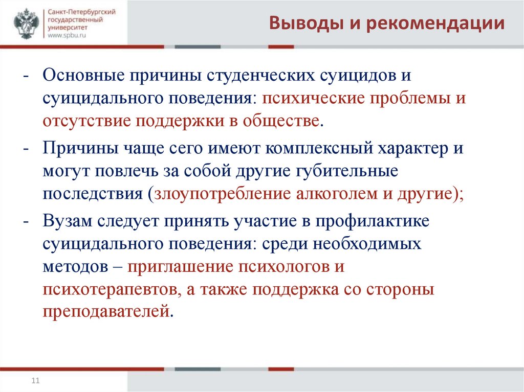 Выводы и рекомендации- Основные причины студенческих суицидов и