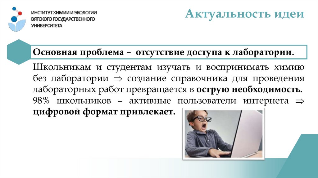 Актуальность идеиОсновная проблема – отсутствие доступа к лаборатории.