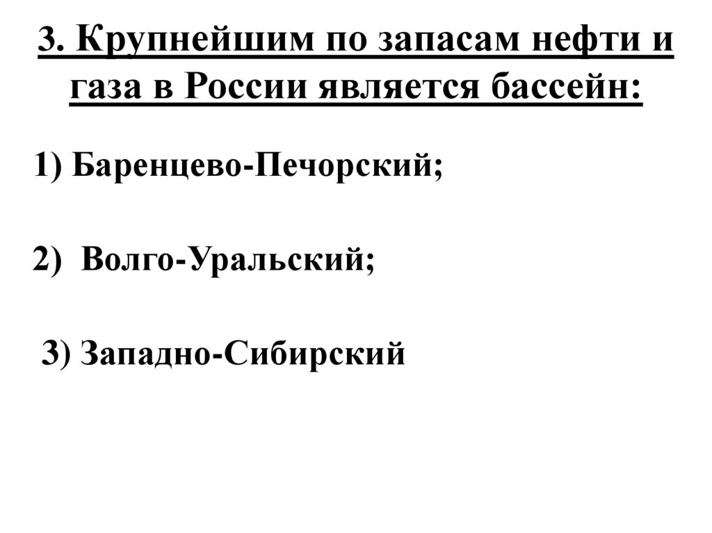 3. Крупнейшим по запасам нефти игаза в России является бассейн: