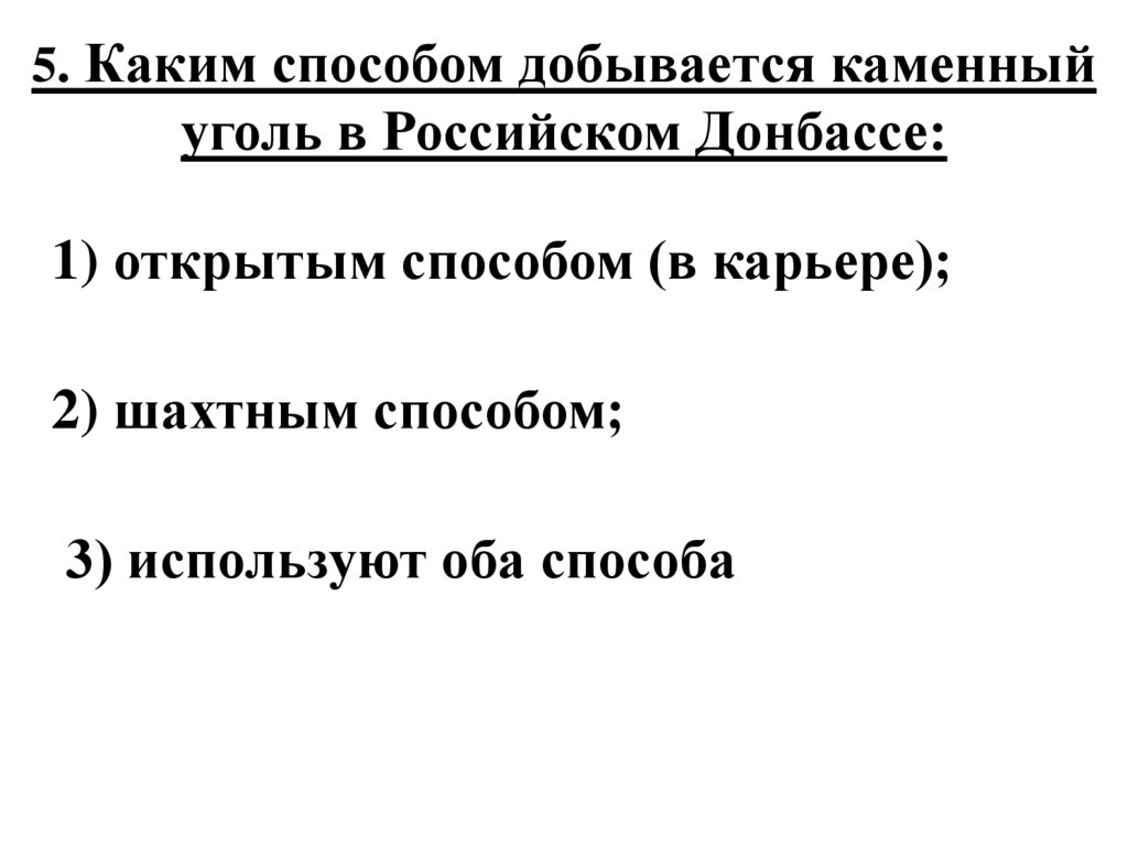 5. Каким способом добывается каменныйуголь в Российском Донбассе: