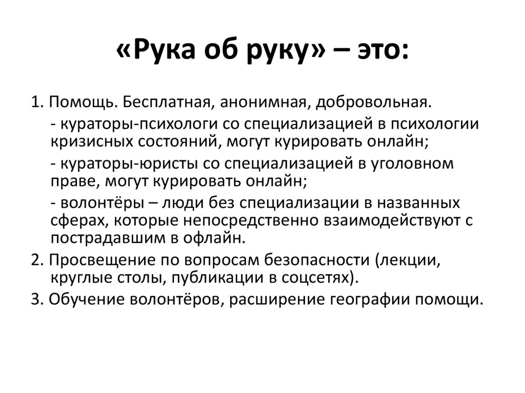 «Рука об руку» – это:1. Помощь. Бесплатная, анонимная, добровольная.