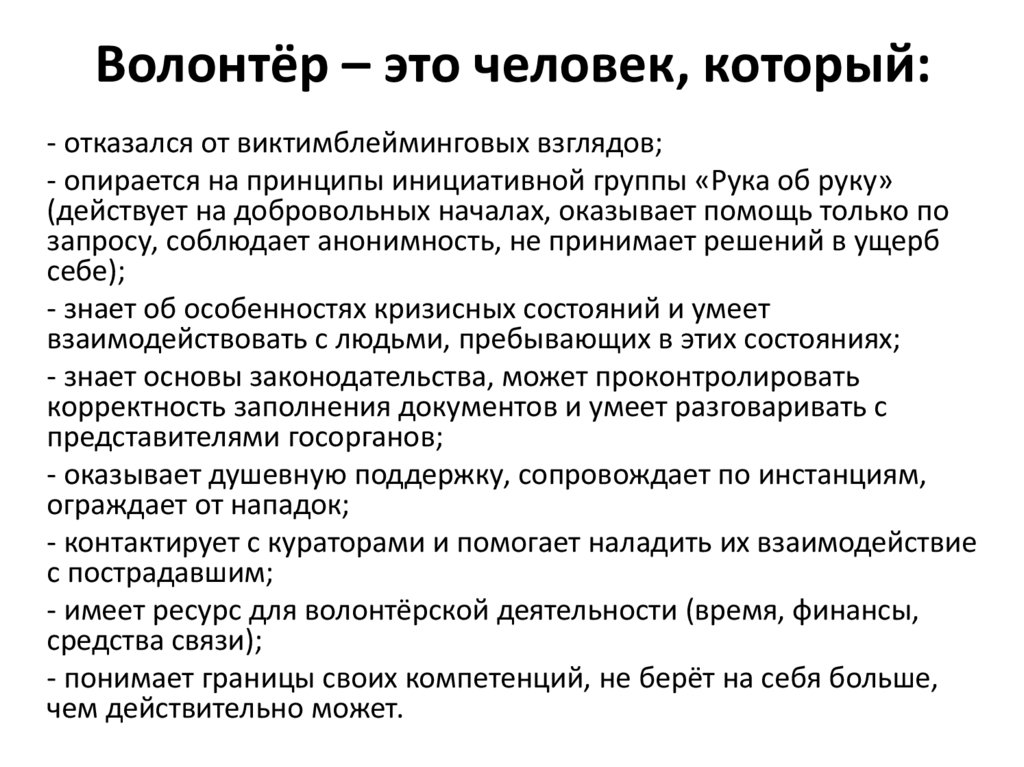 Волонтёр – это человек, который:- отказался от виктимблейминговых взглядов;