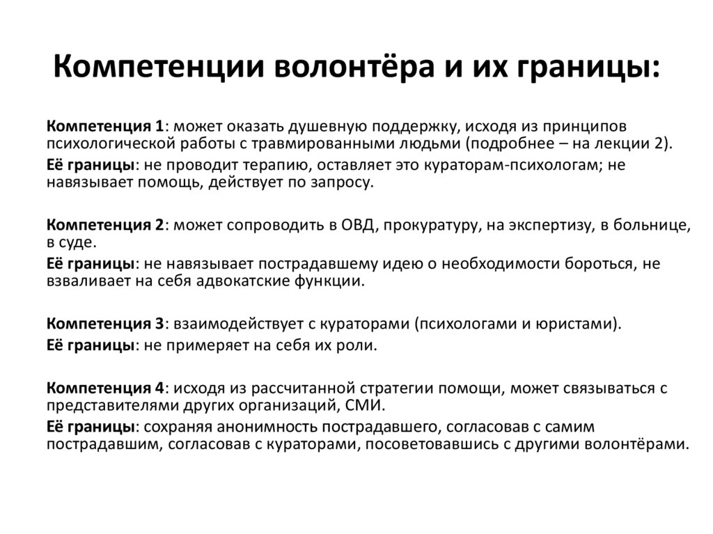 Компетенции волонтёра и их границы:Компетенция 1: может оказать душевную поддержку, исходя из принципов