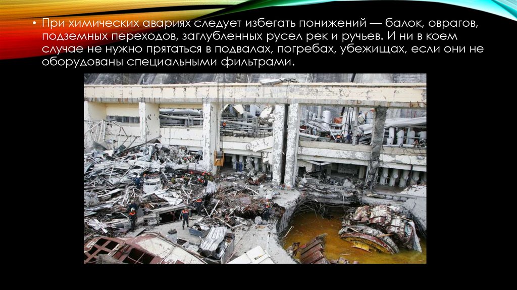 • При химических авариях следует избегать понижений — балок, оврагов,подземных переходов, заглубленных русел рек и ручьев. И ни в коем