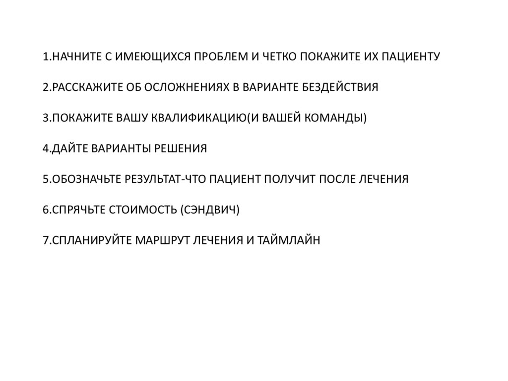 1.НАЧНИТЕ С ИМЕЮЩИХСЯ ПРОБЛЕМ И ЧЕТКО ПОКАЖИТЕ ИХ ПАЦИЕНТУ2.РАССКАЖИТЕ ОБ ОСЛОЖНЕНИЯХ В ВАРИАНТЕ БЕЗДЕЙСТВИЯ