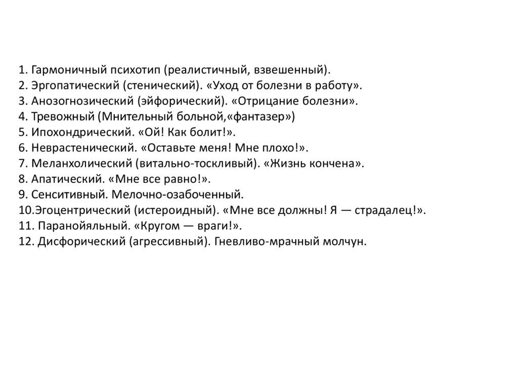 1. Гармоничный психотип (реалистичный, взвешенный).2. Эргопатический (стенический). «Уход от болезни в работу».