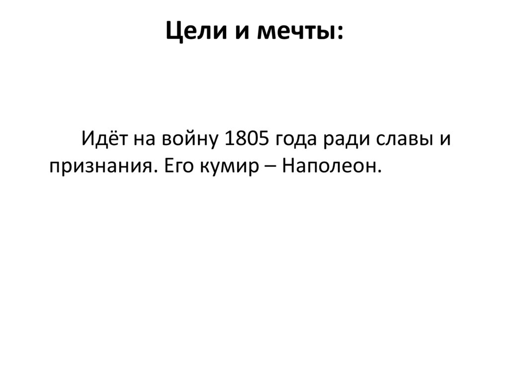 Цели и мечты:Идёт на войну 1805 года ради славы и
