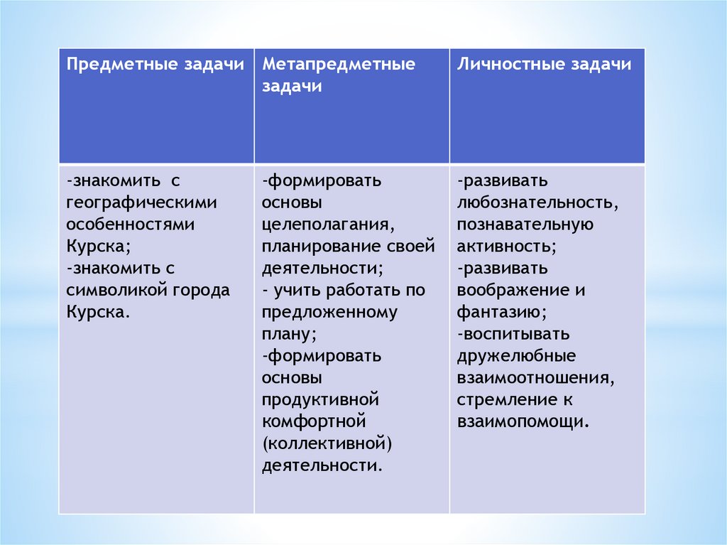 Предметные задачи Метапредметныезадачи