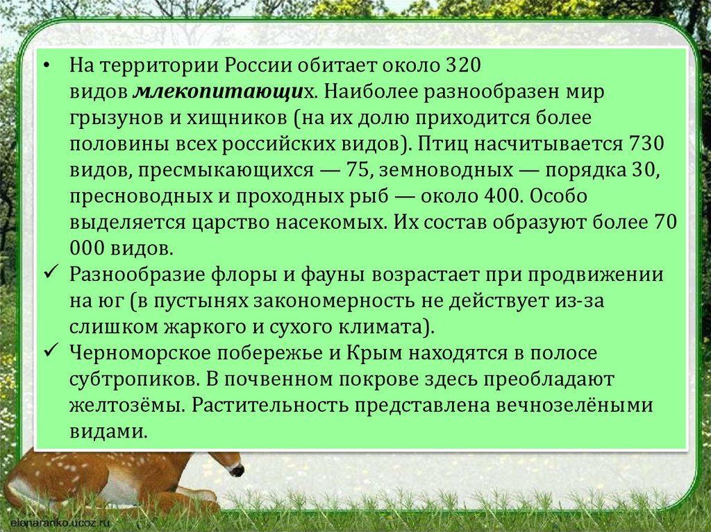• На территории России обитает около 320видов млекопитающих. Наиболее разнообразен мир