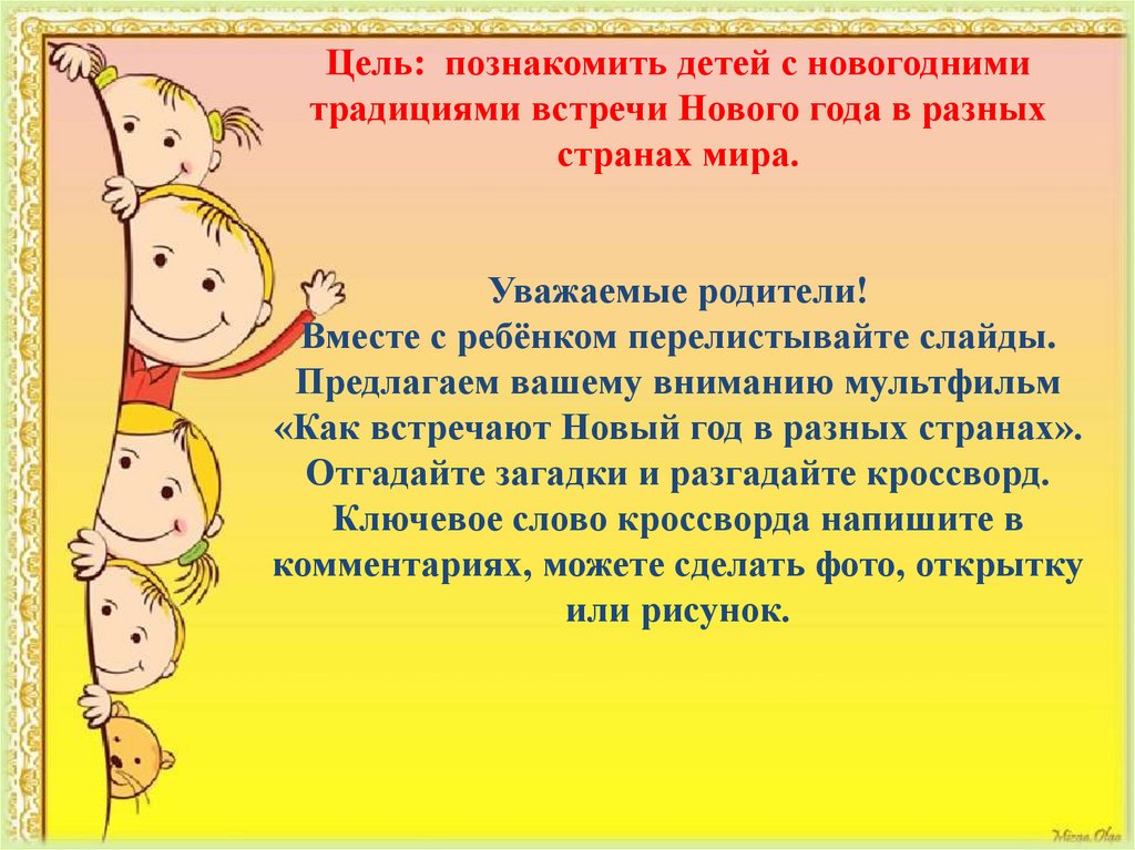 Цель: познакомить детей с новогоднимитрадициями встречи Нового года в разных