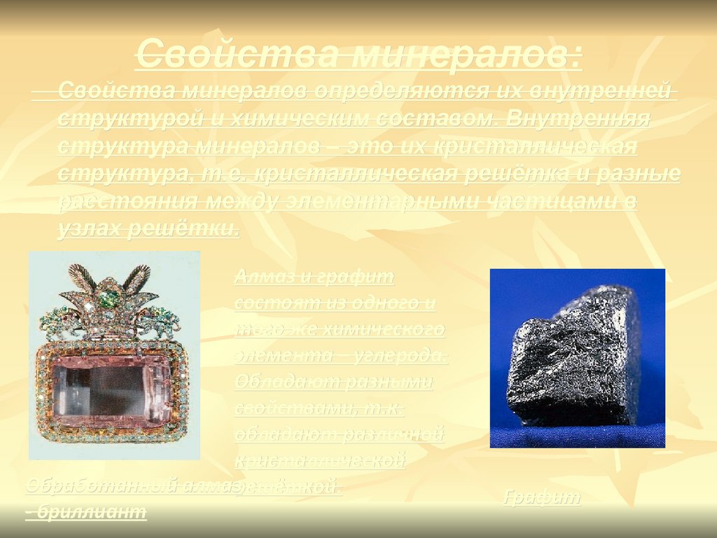 Свойства минералов:Свойства минералов определяются их внутренней