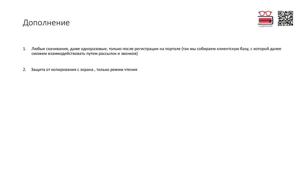 Любые скачивания, даже одноразовые, только после регистрации на портале (так мы собираем клиентскую базу, с которой далее
