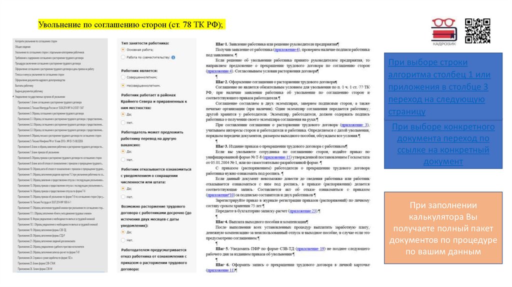 Увольнение по соглашению сторон (ст. 78 ТК РФ);При выборе строки