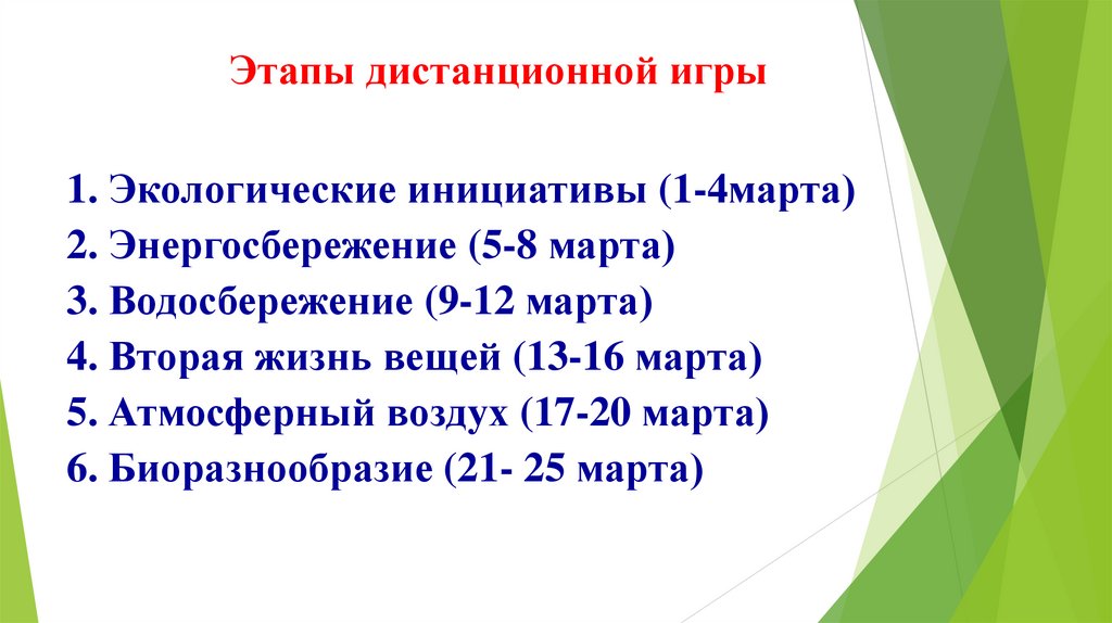 Этапы дистанционной игры1. Экологические инициативы (1-4марта)