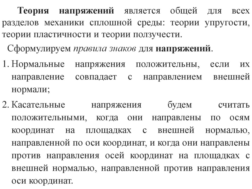 Теория напряжений является общей для всехразделов механики сплошной среды: теории упругости,