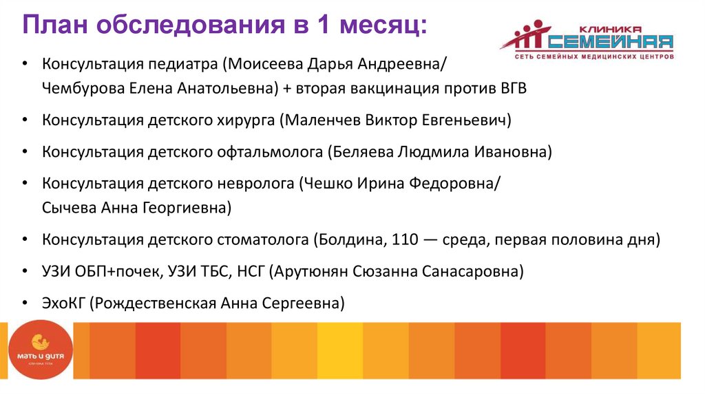 План обследования в 1 месяц:• Консультация педиатра (Моисеева Дарья Андреевна/